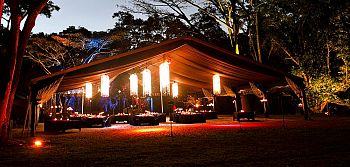 The Flames of the Forest wedding venue is a magical space featuring an elegant, black silk lined marquee, highlighted by stunning, handmade crystal and budlight chandeliers, complemented by a backdrop of budlight stars to the rainforest canopy.