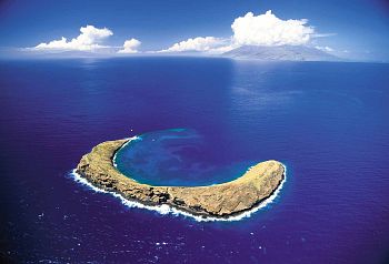 "Molokini is a small, crescent moon-shaped island that is a State Marine Life and Bird Conservation District. Lying only three miles from Maui's southwestern coast, Molokini spans over 18 acres and rises 160 feet above reef-filled waters, offering visitors snorkeling and diving amongst a kaleidoscope of coral and more than 250 species of tropical fish.