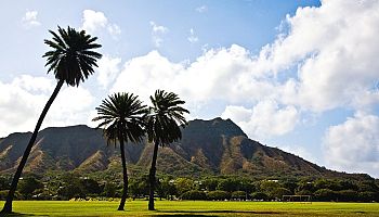 "The iconic silhouette of Diamond Head State Monument sits along the Honolulu skyline just beyond Waikiki. This 760-foot tuff crater is one of Hawaii's most famous landmarks.