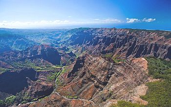"Waimea Canyon, on Kauai's West Side, is described as "The Grand Canyon of the Pacific." Although not as big or as old as its Arizona cousin, you won't encounter anything like this geological wonder in Hawaii. Stretching 14 miles long, one mile wide and more than 3,600 feet deep, the Waimea Canyon Lookout provides panoramic views of crested buttes, rugged crags and deep valley gorges. The grand inland vistas go on for miles.