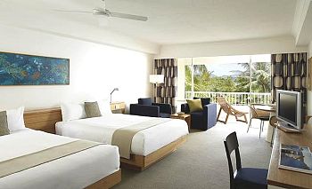 The Reef View Hotel's Garden View rooms have two queen-size beds and the modern décor features muted relaxing tones. Each Garden View room has a bathroom with separate bath and shower, and a private balcony with patio seating for sunset drinks from the mini bar. The flat-screen TV has pay-to-view movies, internet access is available and each room has individually controlled air conditioning and a ceiling fan.