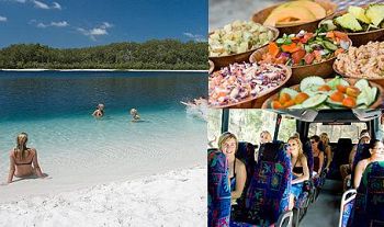 Throughout the day you will touch on and appreciate nature's magnificent paradox. Seemingly endless golden beaches encompass towering hardwood forests, barren heathland, pristine rainforests, huge creeping sandblow deserts, crystal clear freshwater lakes, gurgling blood red streams, prehistoric ferns, mosaic coloured sands