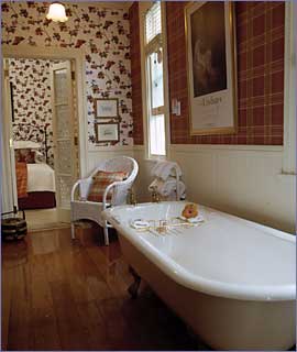 The Tuscany Summer Suite is decorated in calming creams and warming terracotta complemented by vibrant wallpapers and impressive red tartan drapes that add a dramatic look to the room. The large bay window overlooks the remaining Victorian orchard with apple, fig, and plum trees. Matching Victorian Brass bed heads create a king size bed or as twin singles, plush posturepedic mattress, exquisite linens, soft feather pillows, large antique armoire for the entertainment system. The luxurious ensuite has a dressing area, original roll top bath and separate shower. Guests have access to the return verandah from the entrance to the villa where the area for sitting and reading is quiet and peaceful.