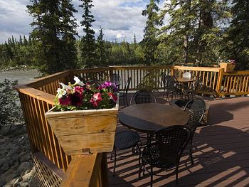 The new 15,375 square foot, two-story Summit Lodge opened in June 2009. Constructed with environmentally responsible material, this new facility features a high-timber lodge look and feel, complete with fully functional fireplace and comfortable seating in the lobby area. The Summit Lodge also offers Denali National Park & Preserve interpretive messaging and is home to the Gold Rush Dining Room, Lucky Miss Saloon, Quigley's Coffee Station, Summit Gift Shop and 24-hour concierge desk. The Summit Lodge sits on the banks of the majestic Nenana River with outdoor seating on a deck with an exterior fire pit and breathtaking views of the Alaskan Wilderness.