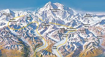 South Hunter Ice Fall (about 2 thousand feet of ice fall) The mighty and stunning Kahiltna Glacier (2 miles wide and 45 miles long) West Ridge of Mount Hunter Climber's Base Camp on the Kahiltna Glacier Beginning of the West Buttress Route, the most climbed route on Denali "The Great One" (A.K.A. Mt. Denali and Mt. McKinley (20,320 ft.), and her two sister peaks Mt. Foraker (17,400 ft.) and Mt. Mount Hunter (14,573 ft.) Mount Frances formally known as "Bergchen," German slang for "Little mountain" The North Buttress of Mount Hunter - a 4,000-foot granite technical showpiece and world class climbing objective Denali's quintessential technical climb - Cassin ridge Meets up with the Blue Flight, the McKinley Experience Tour, at Mt. Huntington