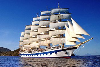 Inspired by the tall ship Preussen, the Royal Clipper has the proud distinction of being the largest and only five-masted full-rigged sailing ship built since her predecessor was launched at the beginning of the last century. With her complement of 42 sails, Royal Clipper is a splendid sight to behold. You might think she was an apparition from the grand age of sail, but Royal Clipper is as new as tomorrow, boasting state-of-the-art navigation systems and every comfort and luxury one could wish for. For connoisseurs of sail cruising, the 439 foot Royal Clipper offers the ultimate sea-going experience, balancing the grandeur, adventure and tradition of sailing with the superb service, amenities and accommodations of the finest modern yacht. Royal Clipper carries just 227 guests in luxurious style. A full 19,000 square feet of open deck and three swimming pools create a wonderfully spacious and expansive outdoor environment. Find your secret hideaway on one of the hidden balconies on either side of the bow. Or climb the mast (with safety harness provided) to one of the passenger lookout crows-nests, thoughtfully furnished with a comfortable settee, where you'll have the grandest view of all! Royal Clipper's interior spaces are just as dazzling. They include a three-deck atrium that funnels sunlight into the elegantly appointed, three-level dining room featuring open-seating dining, deliciously prepared cuisine and a no-tie dress code. A convenient marina platform lowers from the stern for watersports. And the ultimate unique Royal Clipper experience, the one-of-a-kind Captain Nemo Lounge, is the site of our spa and health club with underwater glass portholes!