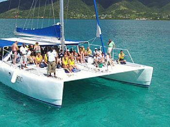 The layout of this luxury catamaran is comfortable and inviting. With plenty of deck area both inside and outside. You can choose to relax in the sun or shade. If you want to lay on the front deck, that's ok. You may get splashed a bit by the water... but it's all part of the fun! Inside is a full bar. We are delighted to serve you a variety of beverages including; fruit punch, soft drinks, water, rum punch and juice.