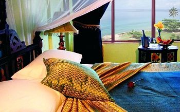 The Deluxe Seaview Rooms are slightly larger than the standard Deluxe Rooms. All rooms are furnished with Zanzibari beds decorated with stylish silk blankets and mosquito netting.